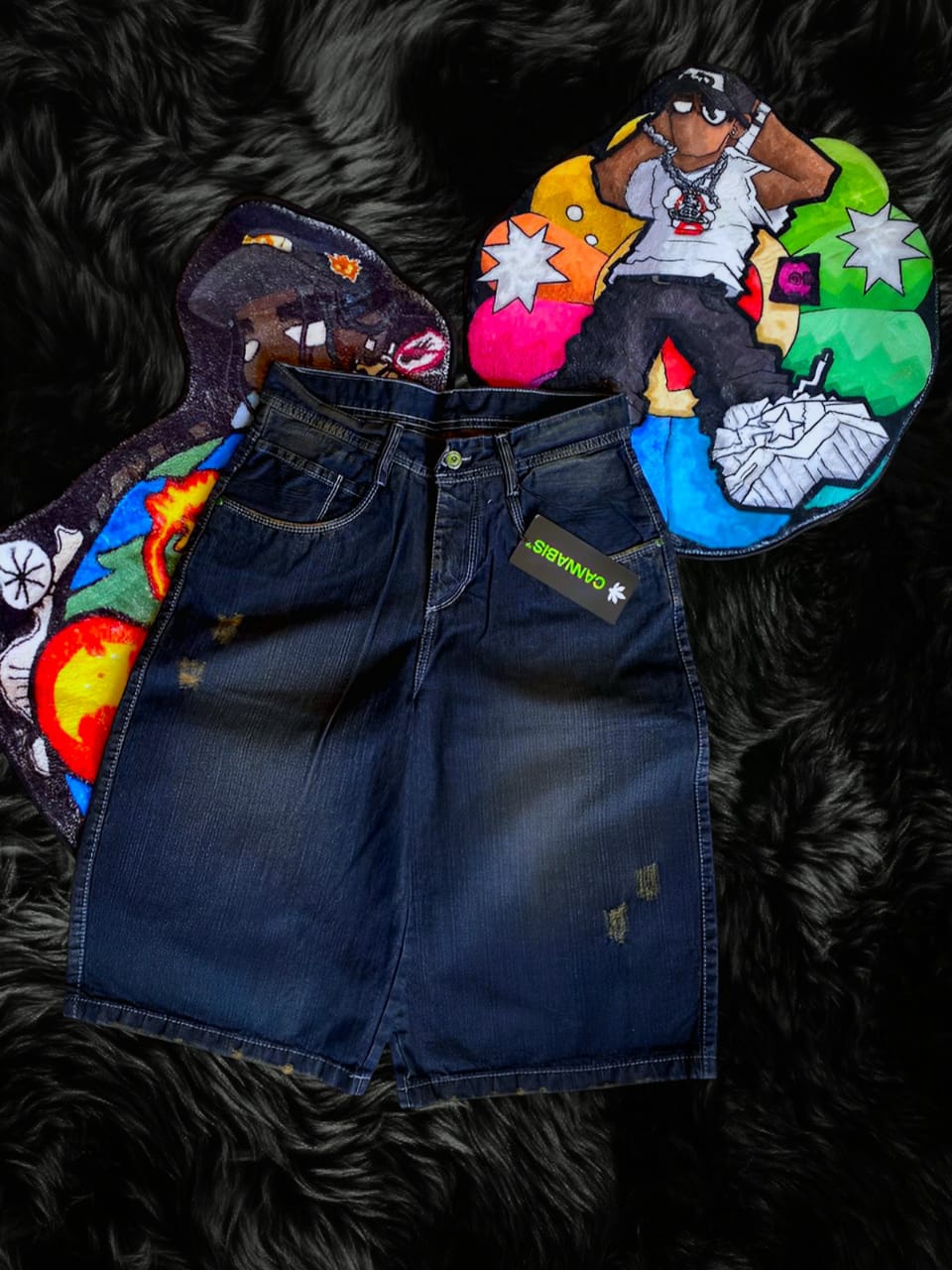 Shorts de mezclilla azul oscuro con detalles desgastados, texturas y estilo urbano relajado Una prenda ideal para quienes quieren romper con lo clásico y destacar con estilo. Va perfecto con hoodies, camisetas oversized y sneakers robustos.